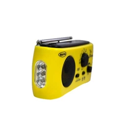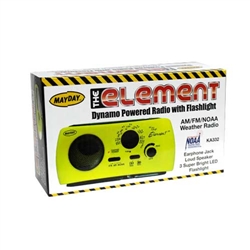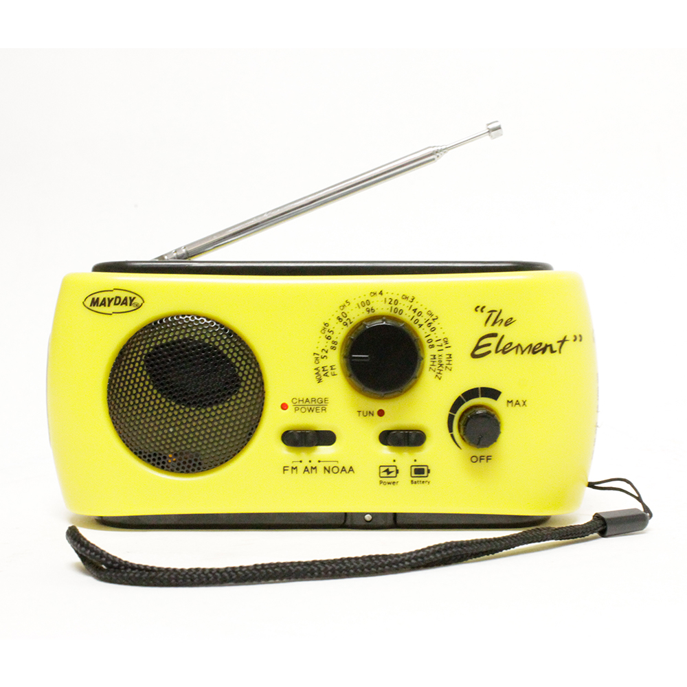 “The Element” by Mayday is a dynamo or solar powered all hazards NOAA weather radio with build in flashlight and female USB input for charging devices.