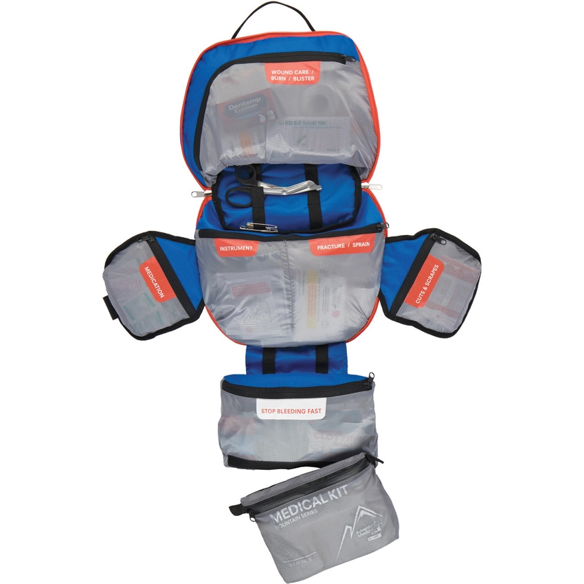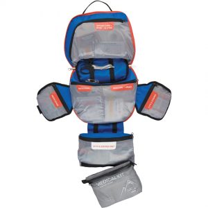 Dimensions: 10.5″ x 6.5″ x 7.5″. Includes: (10) 1″ x 3″ Easy Access bandages; (10) Knuckle bandages; (10) Antiseptic wipe; (3) Triple Antibiotic ointment; (4) Alcohol swab; (2) Tincture of Benzoin; (1) C-Splint, 4″ x 36″ aluminum and foam padded; (2) Triangular bandage; (1) 3″ Elastic bandage with hook and loop closure; (1) Comp. Guide to Wilderness and Travel Medicine; (1) Digital Thermometer, 90F-105F; (1) CPR Face shield; (1) Sterile scalpel, #11 blade; (1) 4″ EMT shears; (1) Duct tape, 2″ x 2.5 yards; (1) Forceps; (3) Safety pins; (2) Large flip-top plastic vial; (2) Small flip-top plastic vial; (1) Patient Assessment Form; (1) Pencil; (1) Register Your Kit Card; (3) After Bite Sting and Bite Relief wipe; (4) Diamode (Loperamide HCI 2mg); (8) Aspirin (325mg); (4) Antihistamine (Diphenhydramine 25mg); (16) Ibuprofen (200mg); (8) Acetaminophen (500mg); (10) Medicidin-D (Acetaminophen 325mg, Chlorpheniramine Maleate 2mg, Phenylephrine HCI 5mg); (12) Antacid (Calcium Cabonate 420mg); (3) Cortizone Cream 1%, 0.9g; (2) Oral rehydration salts; (1) Glucose powder, 15g; (1) Filling mixture with pain relief; (1) SWAT-T tourniquet; (1) 3″ x 24″ QuikClot gauze; (1) 8″ x 10″ Trauma pad; (1) 5″ x 9″ Trauma pad; (6) Pair Nitrile gloves; (1) 20cc 18 gauge wound irrigation tool; (1) Sterile scrub brush; (10) 4″ x 4″ wound closure strip; (8) 4″ x 4″ Sterile gauze dressing; (8) 2″ x 2″ Sterile gauze dressing; (4) 3″ x 4″ Non-adherent sterile dressing; (2) 3″ Conforming gauze bandage; (1) AfterBurn Aloe Vera gel with Lidocaine, 2 oz; (1) Tape, 1″ x 10 yards; (2) Small rectangular GlacierGel; (28) Pre-cut and shaped Moleskin; (4) Cotton tip applicator. Weight: 3.1lb. Comes in zippered nylon storage/carry bag with top carry handle.