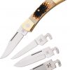 Set includes 4 1/2″ closed lockback. 3 1/2″ knife blade features replaceable 420J2 stainless razor blade with black-oxide coated blade holder for added support and thumb stud. 3″ stainless gutting blade with thumb stud. Orange rubberized TPR handles. Also includes a 5″ closed lockback. 4 1/2″ 65 Mn carbon steel saw blade with chrome coat. Orange 6061-T6 aluminum handles. Comes with six surgical 420 stainless razor blades. Camo nylon belt sheath holds all.