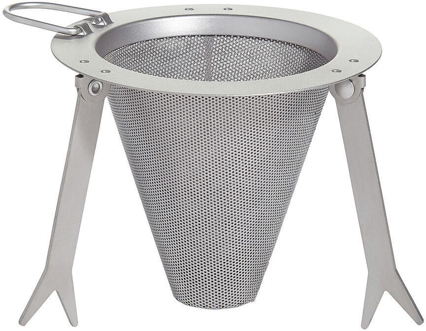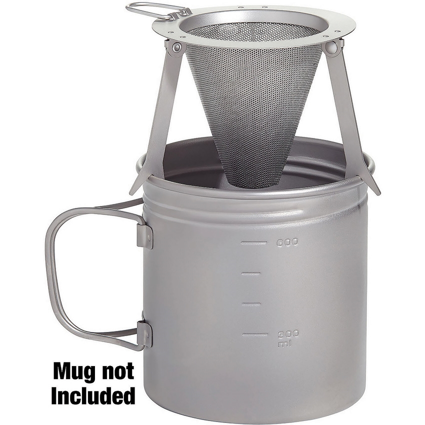 Dimensions: 3.5″ x 2.8″. 1.27oz. Features: Folding handle, double mesh construction, and talon-style folding legs. Reusable and eco-friendly. Easy to clean and store. Fits most mugs. Titanium construction.
