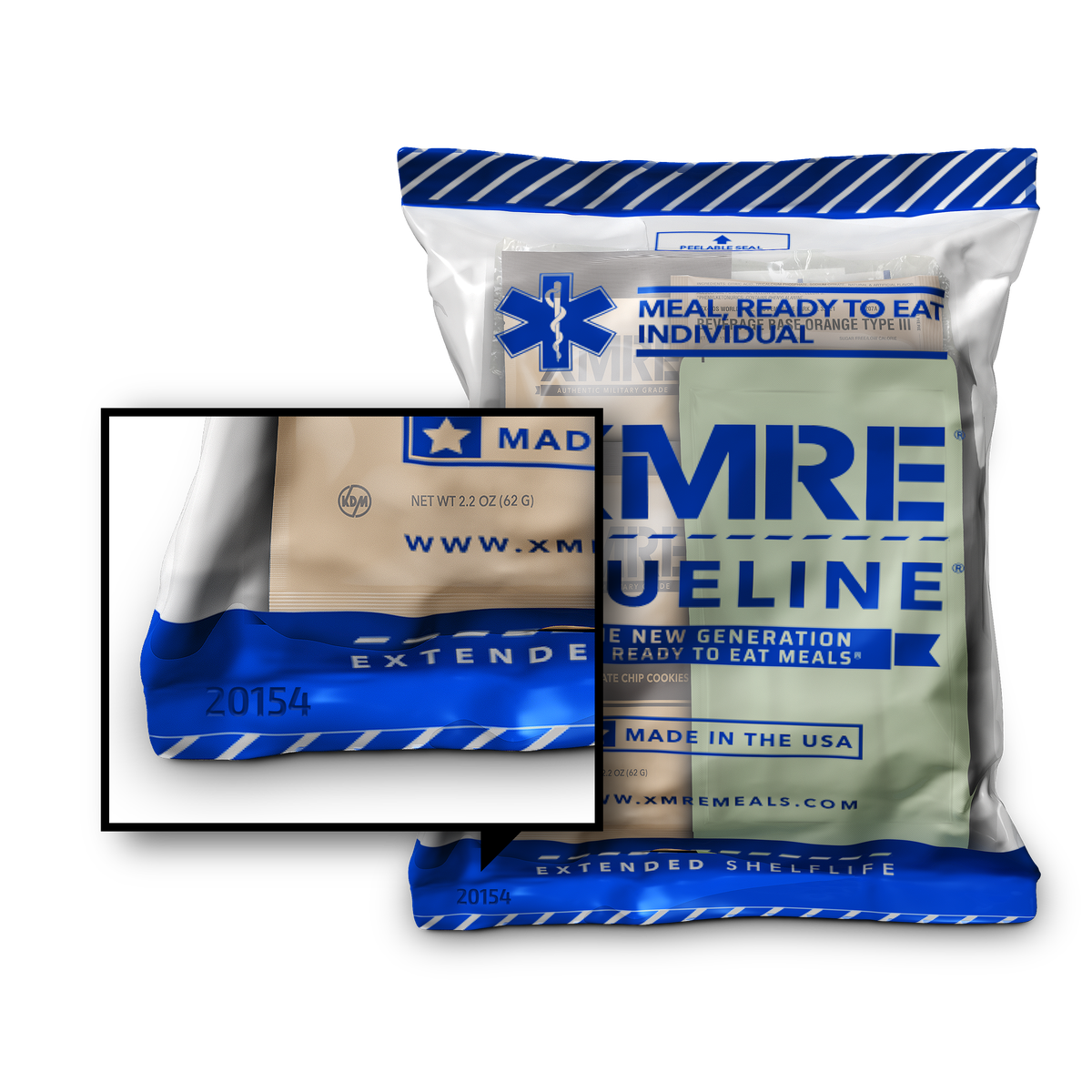 Entrée, 2-3 side items, beverage, and an accessory kit including spoon, napkin condiment kit and an optional flameless ration heater (FRH). All components are packed in high density water and tamper proof XMRE Blue Line® outer bag and embossed with a lot number (pack date) on each bag and case.